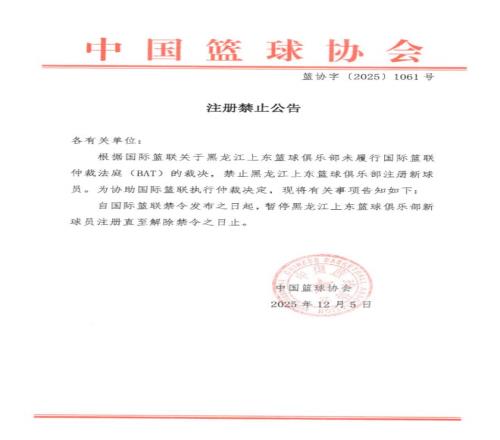 中国篮协:暂停黑龙江上东篮球俱乐部新球员注册
