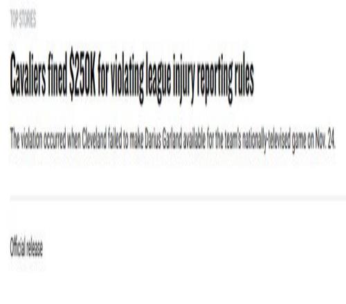 据NBA官方说明,本次违规事由为:全明星控卫加兰本可出战11月25日对阵多伦多猛龙的全美直播赛事,但骑士队却安排他在赛前一天(非全美直播的)对阵快船的比赛中登场,导致其缺席了这场全美直播的较量。