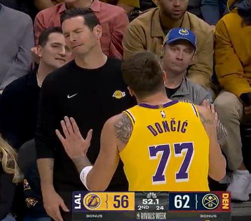 第三节开场东契奇的表现再度回暖,他连拿9分4助攻帮助湖人缩小到3分,但东契奇的大腿/膝盖附近被撞了一下雷迪克为了保护东契奇换下他检查休息。东契奇三节27分钟,19中12,三分7中3,拿到32分10篮板7助攻2抢断仅1失误。