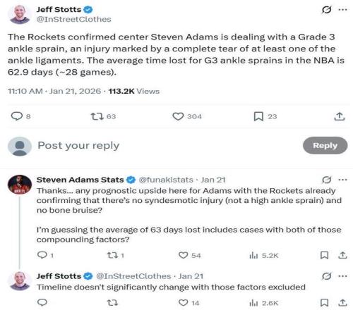 在此前火箭对阵鹈鹕的比赛中,亚当斯脚踝扭伤退场,最终确诊为三级扭伤,即至少有一根韧带断裂,通常需要3-6个月时间才能恢复运动重返赛场,目前亚当斯的状态也为无限期缺阵,不排除赛季报销可能。