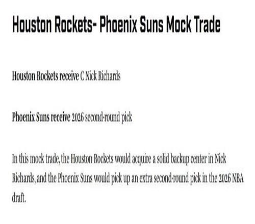 亚当斯重伤无限期缺阵后,休赛期曾8换1杜兰特实现双赢的火箭与太阳应该再次在交易截止日前合作?美媒建议休城1换1拿下在太阳队郁郁不得志的理查兹。