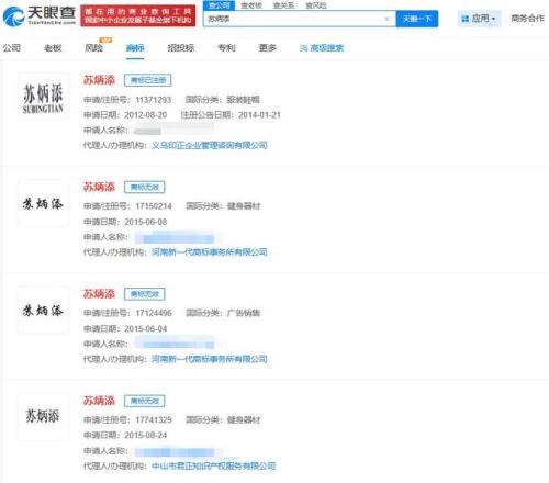 天眼查知识产权信息显示,“苏炳添”曾被多方申请注册为商标,国际分类涉及服装鞋帽、健身器材、广告销售,当前商标状态多为无效,已注册的服装鞋帽类“苏炳添”也被无效宣告。