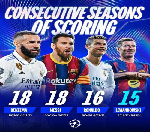 欧冠历史上,只有本泽马(18个赛季)、梅西(18个赛季)和C罗(16个赛季)连续进球赛季比莱万更多。