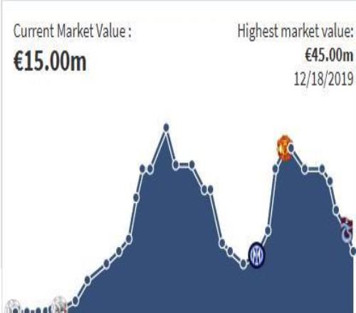 奥纳纳的身价巅峰出现在2019年12月18日,当时他效力于阿贾克斯,身价来到了4500万欧。从国米加盟曼联后,他的身价又迎来了第二次高峰,达到了4000万欧元,不过自那以后,奥纳纳的身价就一路下滑,目前已经来到了1500万欧。